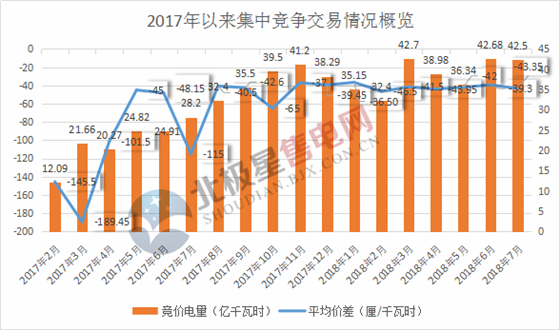 值得注意的是,本月價差再度持續(xù)走低,平均價差僅為-43.35厘/千瓦時,與2018年4月價差持平,成交量與上月相比基本持平。7月份市場用電總需求電量為146.5億千瓦時,扣除年度合同電量104億千瓦時后,集中競爭電量需求為42.5億千瓦時,7月集中競爭電量需求扣除必開頂峰電量19.9億,已申請強(qiáng)制成交電量1.9億千瓦時后,有效競爭電量需求為20.7億千瓦時。