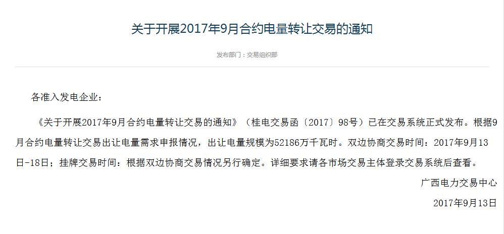 2017年9月18日,廣西電力交易中心發(fā)布2017年9月合約電量轉(zhuǎn)讓掛牌交易時(shí)間的通知?!锻ㄖ分蟹Q(chēng),根據(jù)2017年9月合約電量轉(zhuǎn)讓雙邊協(xié)商交易結(jié)果,剩余電量定于2017年9月20日9:00至11:00以掛牌交易的方式開(kāi)展。交易規(guī)模為52186萬(wàn)千瓦時(shí)。