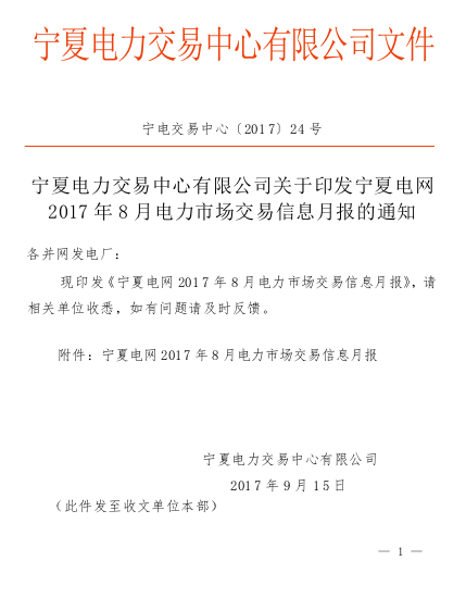 根據(jù) 2017 年發(fā)電量計劃指標(biāo)交易合同(在役機組),8月份完成發(fā)電權(quán)交易電量(上網(wǎng)電量)1.82億千瓦時,其中寧夏鹽池、哈納斯新能源替代哈納斯東部熱電廠發(fā)電0.52億千瓦時,哈納斯東部熱電廠等效利用小時數(shù)為95小時。國電大武口熱電廠替代國電石電一廠發(fā)電0.80億千瓦時,華電靈武二廠替代哈納斯東部熱電廠發(fā)電0.50億千瓦時。1-8月份,發(fā)電權(quán)累計交易電量(上網(wǎng)電量)6.71億千瓦時,其中寧夏鹽池、哈納斯新能源累計替代哈納斯東部熱電廠發(fā)電3.81億千瓦時,京能寧東電廠累計替代哈納斯西部熱電廠發(fā)電0.60億千瓦時,國電大武口熱電廠累計替代國電石電一廠發(fā)電0.80億千瓦時,華電靈武二廠累計替代哈納斯