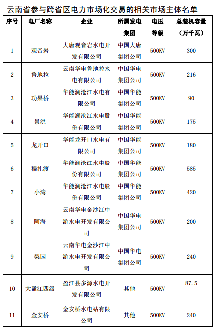 附件:云南省參與跨省區(qū)電力市場(chǎng)化交易相關(guān)市場(chǎng)主體名單(另附)