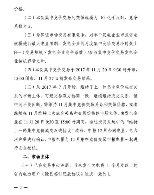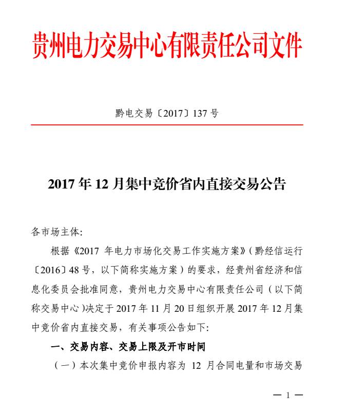 11月16日,貴州電力交易中心發(fā)布了《2017年12月集中競價(jià)省內(nèi)直接交易公告》,公告稱將于11月20日組織開展12月集中競價(jià)省內(nèi)直接交易,交易規(guī)模為10億千瓦時(shí),競爭系數(shù)為2。