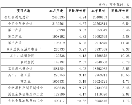 (一)分行業(yè)用電量情況。10月份,第一產(chǎn)業(yè)完成用電量3.6億千瓦時(shí),同比增長(zhǎng)3.33%;第二產(chǎn)業(yè)完成用電量190.82億千瓦時(shí),同比增長(zhǎng)4.32%;第三產(chǎn)業(yè)完成用電量19.53億千瓦時(shí),同比增長(zhǎng)5.05%;全省城鄉(xiāng)居民生活用電27.07億千瓦時(shí),同比增長(zhǎng)3.27%。工業(yè)用電量188.13億千瓦時(shí),同比增長(zhǎng)4.02%,其中,輕工業(yè)用電量27.67億千瓦時(shí),同比增長(zhǎng)9.13%,重工業(yè)用電量160.45億千瓦時(shí),同比增長(zhǎng)3.19%。10月份,有色金屬行業(yè)用電量40.94億千瓦時(shí),同比減少2.32%。黑色金屬行業(yè)用電量12.96億千瓦時(shí),同比減少4.17%。化學(xué)原料及制品制造行業(yè)用電量22.86億千瓦時(shí),同比增長(zhǎng)9.77%。