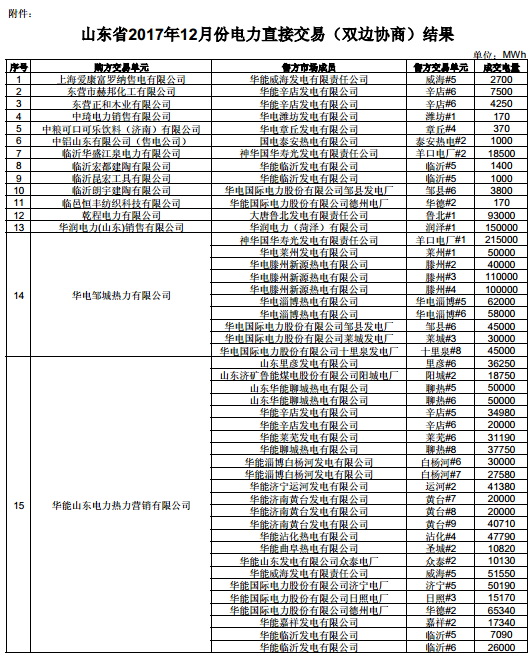 11月21日,山東電力交易中心發(fā)布了《12月份電力直接交易(雙邊協(xié)商)結(jié)果的公告》,公告稱38家統(tǒng)調(diào)發(fā)電企業(yè)(56臺發(fā)電機(jī)組)與52家電力用戶以及61家售電公司通過山東電力交易平臺完成了2017年12月份雙邊電力直接