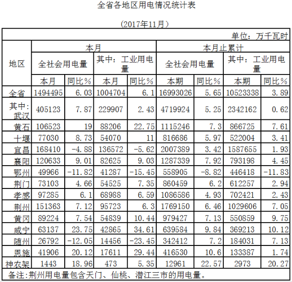 湖北11月全社會用電量149.45億千瓦時 同比增6.03%