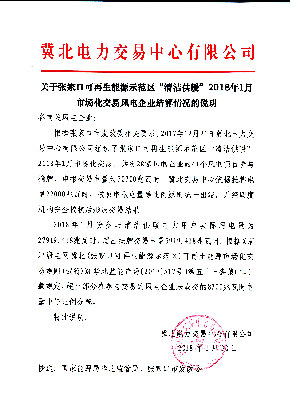 《關(guān)于張家口可再生能源示范區(qū)“清潔供暖”2018年1月市場(chǎng)化交易風(fēng)電企業(yè)結(jié)算情況的說明》