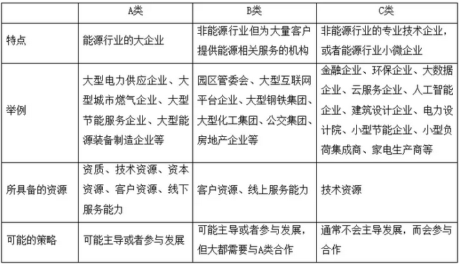 C類企業(yè)是非能源行業(yè)的專業(yè)技術企業(yè),或者能源行業(yè)小微企業(yè),具有專業(yè)服務能力、專利技術資源等,由于缺乏資質、技術、客戶等資源,很難主導發(fā)展綜合能源服務企業(yè),主要以參與為主。由于綜合能源服務企業(yè)會提供一定的非能源服務,例如垃圾處理、碳交易、物業(yè)管理、建筑物維護、節(jié)水管理、智慧生活、大氣治理等,以充分滿足客戶多元需求、增強客戶粘性,因此需要與非能源行業(yè)提供專業(yè)技術服務的企業(yè)合作。另外,綜合能源服務企業(yè)為了更快速填補資源空白,會與能源行業(yè)小微企業(yè)合作,例如專業(yè)節(jié)能企業(yè)、能源大數(shù)據(jù)企業(yè)等,以使用小微企業(yè)的技術資源和快速響應的服務能力。尤其對于采用開放平臺型商業(yè)模式的綜合能源服務企業(yè),更將會與數(shù)量眾多的C類企業(yè)合作。