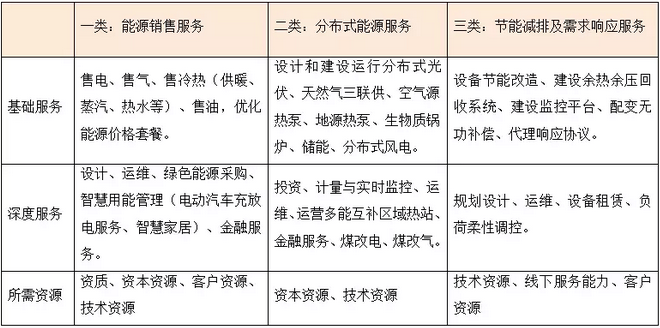 “能源服務”,根據(jù)《能源詞典》,是指通過能源的使用為消費者提供的服務。筆者按照專業(yè)關聯(lián)的緊密程度和業(yè)務發(fā)展模式的相似程度,將能源服務歸納為三類。第一類是能源銷售服務,包括售電、售氣、售熱冷、售油等基礎服務,以及用戶側管網(wǎng)運維、綠色能源采購、利用低谷能源價格的智慧用能管理(例如在低谷時段蓄熱、給電動汽車充電)、信貸金融服務等深度服務。第二類是分布式能源服務,包括設計和建設運行分布式光伏、天然氣三聯(lián)供、生物質鍋爐、儲能、熱泵等基礎服務,以及運維、運營多能互補區(qū)域熱站、融資租賃、資產證券化等深度服務。第三類是節(jié)能減排服務及需求響應服務,包括改造用能設備、建設余熱回收、建設監(jiān)控平臺、代理簽訂需求響應協(xié)議等基礎服務,和運維、設備租賃、調控空調、電動汽車、蓄熱電鍋爐等柔性負荷參與容量市場、輔助服務市場、可中斷負荷項目等深度服務。