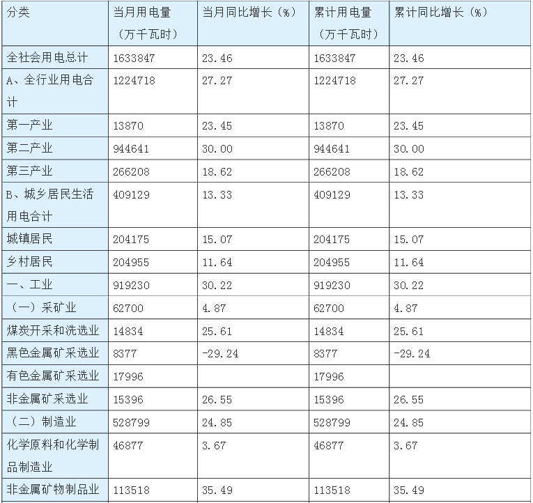 各行業(yè)用電量當(dāng)月及累計(jì)增長情況具體見下表: