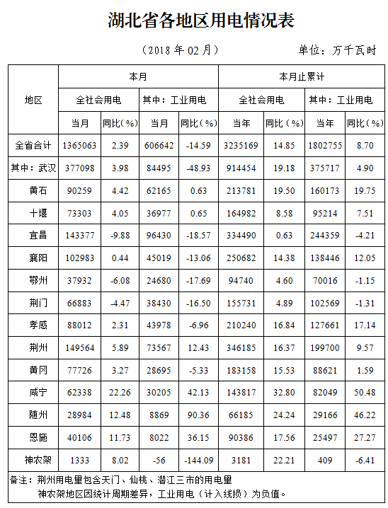 (五)全省各地區(qū)全社會用電普遍增長,大部分地區(qū)增速較快。元至二月份,全省14個(gè)用電統(tǒng)計(jì)地區(qū)全社會用電普遍增長,其中咸寧、隨州、神農(nóng)架3個(gè)地區(qū)全社會用電增幅超20%,武漢、黃石、恩施等7個(gè)地區(qū)增幅也在10%以上;從工業(yè)用電情況看,武漢、咸寧、隨州等10個(gè)地區(qū)均有不同程度增長,受去低端產(chǎn)能和產(chǎn)業(yè)結(jié)構(gòu)優(yōu)化影響,宜昌、鄂州、荊門、神農(nóng)架4個(gè)地區(qū)用電小幅下滑。