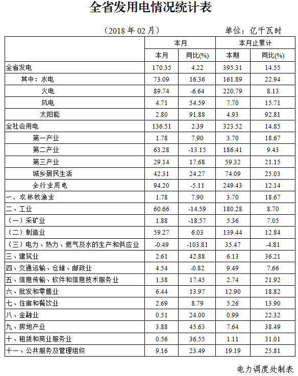 元至二月,全省用電快速增長,發(fā)供電生產(chǎn)秩序平穩(wěn),電力供應(yīng)保障有力,總體情況良好。全省累計(jì)發(fā)電395 31億千瓦時(shí),增長14 55%;全社會累計(jì)用電32