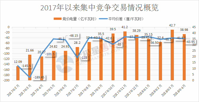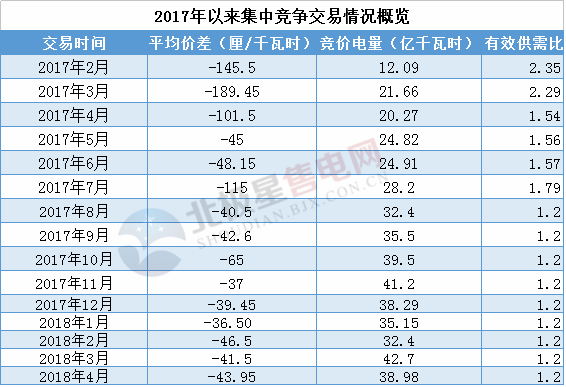 從2017年8月份開始,廣東的月度集中競價的有效供需比就鎖定在了1.2,這也從客觀上決定了月度競價價差的趨穩(wěn),2017年,廣東共組織了11場月度競爭交易,累計成交電量319.6億千瓦時,平均價差為-68.9厘/千瓦時。從今年已經進行的4場交易來看,一共成交電量149.23億千瓦時,平均價差在-42.11厘/千瓦時。