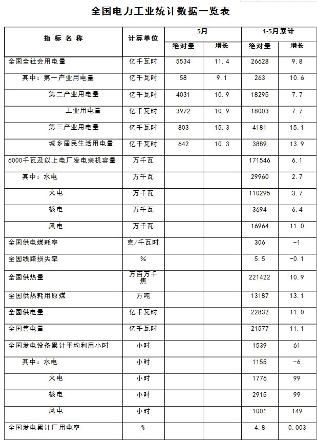 1-5月份全國(guó)電力工業(yè)統(tǒng)計(jì)數(shù)據(jù)發(fā)布:全國(guó)售電量21577億千瓦時(shí) 同比增11.1%