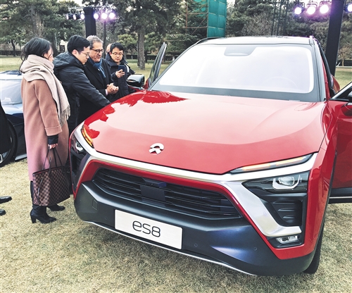 圖為與會(huì)嘉賓參觀高性能智能電動(dòng)7座SUV——蔚來(lái)汽車ES8。 楊忠陽(yáng)攝