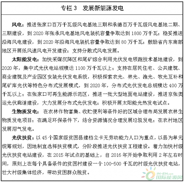 加快發(fā)展太陽(yáng)能發(fā)電。有序建設(shè)一批大型光伏發(fā)電基地;支持發(fā)展居民、商業(yè)、公共建筑等分布式光伏發(fā)電,積極探索農(nóng)光、林光、漁光等特色分布式發(fā)展模式;積極開展太陽(yáng)能光熱發(fā)電示范試點(diǎn)。到2020年,力爭(zhēng)全省光伏發(fā)電裝機(jī)容量達(dá)到1500萬(wàn)千瓦以上,光熱發(fā)電50萬(wàn)千瓦。以國(guó)家級(jí)扶貧開發(fā)重點(diǎn)縣和燕山-太行山集中連片特困地區(qū)為重點(diǎn),采用集中式地面電站、村級(jí)電站及屋頂分布式等模式,推動(dòng)光伏扶貧建設(shè)。