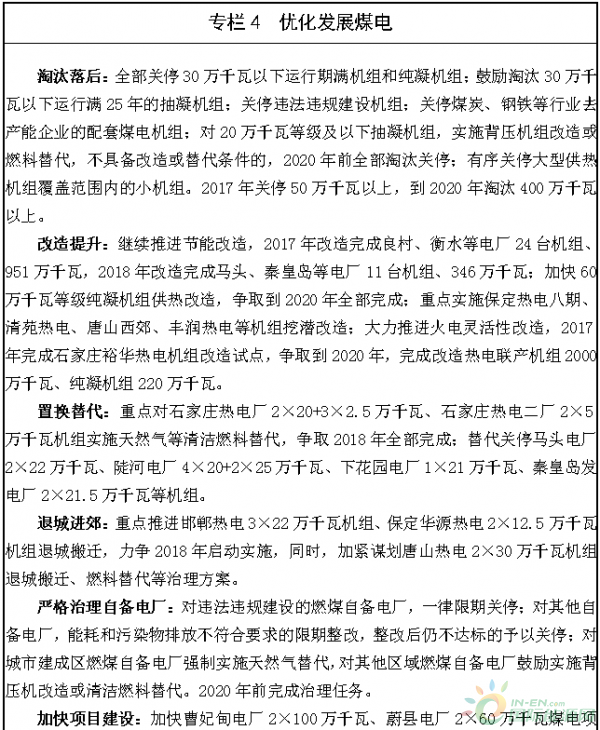 通過(guò)實(shí)施淘汰落后、改造提升、置換替代、退城進(jìn)郊,加快優(yōu)化煤電結(jié)構(gòu),提高裝機(jī)水平,優(yōu)化布局,降低煤耗,減少排放。淘汰落后機(jī)組400萬(wàn)千瓦以上,改造提升1700萬(wàn)千瓦以上,城市建成區(qū)煤電機(jī)組全部實(shí)施清潔燃料替代或退城搬遷。按照試點(diǎn)先行、有序推進(jìn)的原則,逐步對(duì)省內(nèi)30萬(wàn)千瓦等級(jí)及以上燃煤熱電機(jī)組和純凝機(jī)組實(shí)施靈活性改造,大幅提高機(jī)組調(diào)峰能力。統(tǒng)籌全省淘汰落后機(jī)組容量,充分考慮環(huán)境承受能力,按照等容量、減煤量、減排放原則,有序布局建設(shè)超超臨界支撐電源和超臨界熱電機(jī)組。加大協(xié)調(diào)服務(wù)力度,盡快完善已核準(zhǔn)項(xiàng)目相關(guān)手續(xù),加快工程建設(shè)進(jìn)度。嚴(yán)格治理自備電廠,鼓勵(lì)支持發(fā)展背壓機(jī)組。到2020年,基本形成布局合理、清潔高效、保障有力的煤電結(jié)構(gòu)。