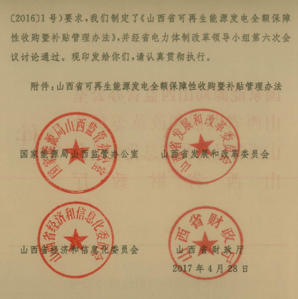 山西發(fā)改委、經(jīng)信委、財政廳、山西能監(jiān)辦近日聯(lián)合發(fā)布《關于印發(fā)山西省可再生能源發(fā)電全額保障性收購暨補貼管理辦法》的通知,辦法適用于山西省境內風力發(fā)電、太陽能發(fā)電、生物質能發(fā)電、地熱能發(fā)電等非水可再生能源,水力發(fā)電參照執(zhí)行。