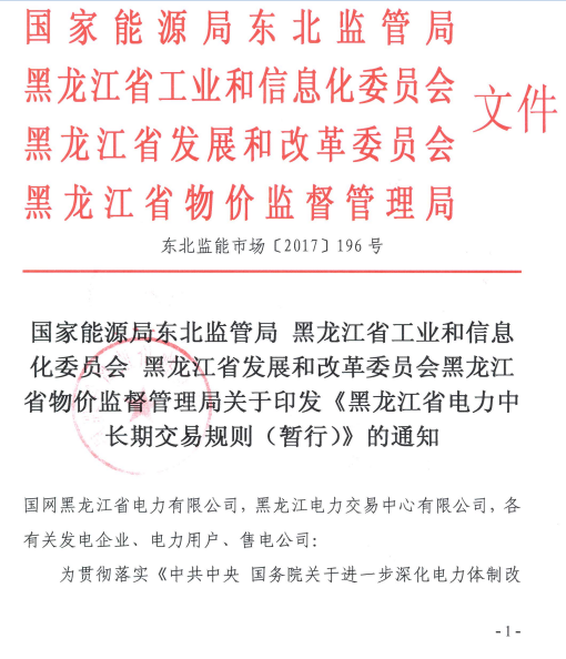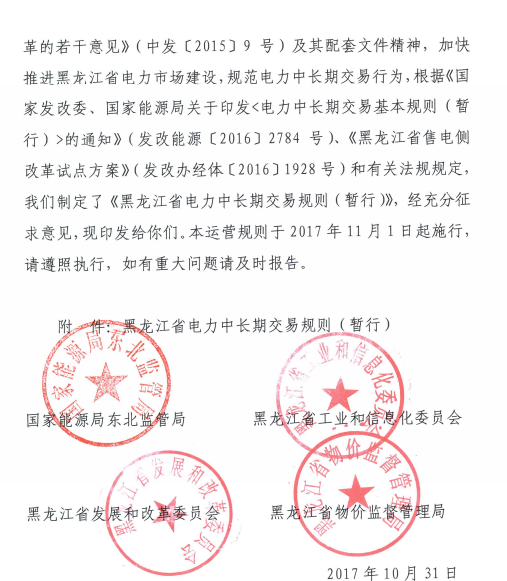 日前,國家能源局東北監(jiān)管局、黑龍江省工業(yè)和信息化委員會、黑龍江省發(fā)展和改革委員會和黑龍江省物價監(jiān)督管理局聯(lián)合發(fā)布《黑龍江省電力中長