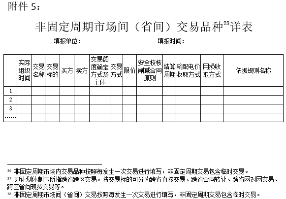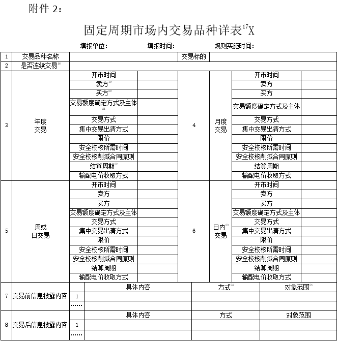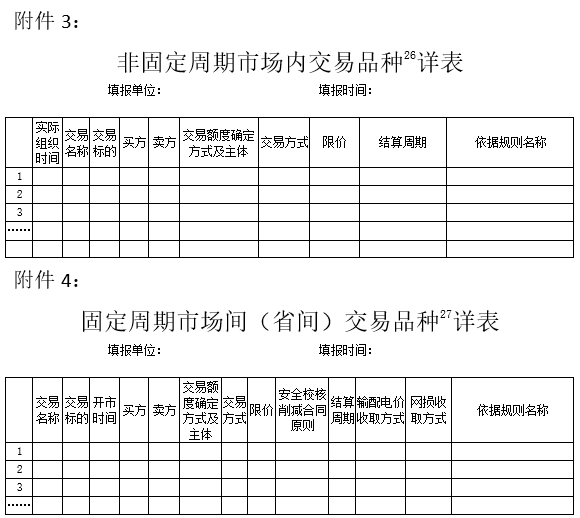 17.本表按周期性進行交易的市場內(nèi)交易標的品種填寫,一個交易品種填寫一張,例如直接交易、合同轉(zhuǎn)讓交易、調(diào)峰交易等。交易標的主要指時標電量、電量、輔助服務、合同約定電量(電力、輔助服務)等。如有以年度交易方案等交易規(guī)則性質(zhì)文件的,則按年度填寫,每個年度方案對應一張表。