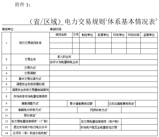 一、請各單位獨立填報調(diào)查問卷(詳見附件1~附件6)。其中,附件1為電力交易規(guī)則基本情況,附件2、3為市場內(nèi)電力交易品種有關情況,附件4、5為市場間(跨省跨區(qū))電力交易品種有關情況,附件6為有關情況文字說明。本次調(diào)查面向全社會公開,希望有關單位和市場主體積極填報。