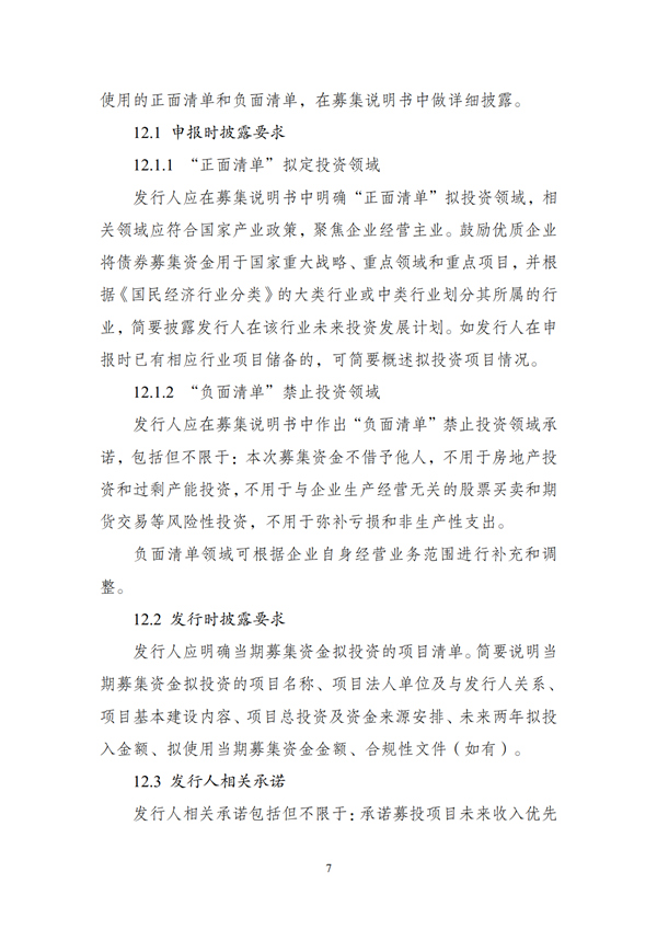 (二)申報材料應(yīng)明確債券募集資金禁止投向領(lǐng)域,形成“負(fù)面清單”。“負(fù)面清單”包括但不限于:將募集資金借予他人,用于房地產(chǎn)投資和過剩產(chǎn)能投資,用于與企業(yè)生產(chǎn)經(jīng)營無關(guān)的股票買賣和期貨交易等風(fēng)險性投資,用于彌補(bǔ)虧損和非生產(chǎn)性支出。“負(fù)面清單”領(lǐng)域可根據(jù)企業(yè)自身經(jīng)營業(yè)務(wù)范圍進(jìn)行補(bǔ)充和調(diào)整。
