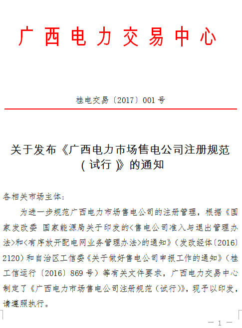 關(guān)于發(fā)布《廣西電力市場售電公司注冊規(guī)范(試行)》的通知