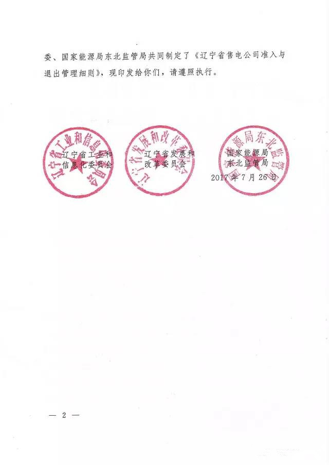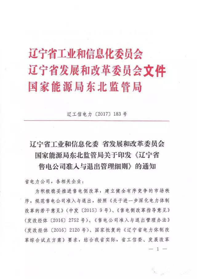 遼寧省工業(yè)和信息化委員會(huì)、遼寧省發(fā)展改革委、能源局東北監(jiān)管局7月26日聯(lián)合下發(fā)了《遼寧省售電公司準(zhǔn)入與退出細(xì)則》,全文如下:
