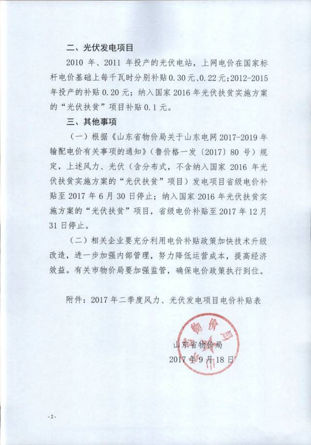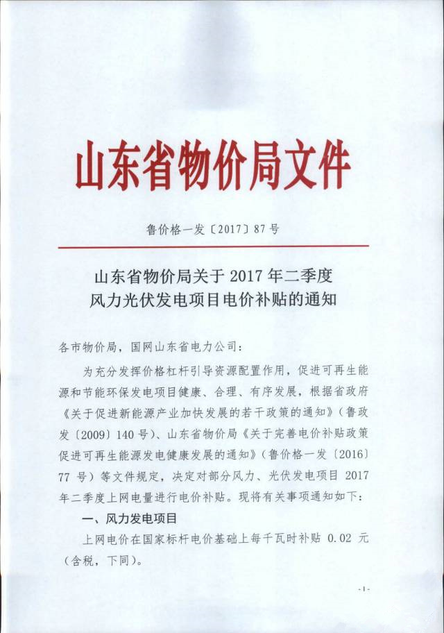 山東省物價局日前發(fā)布了《山東省物價局關于2017年二季度風力光伏發(fā)電項目電價補貼的通知》。通知中稱,決定對部分風力、光伏發(fā)電項目2017年二季度上網(wǎng)電量進行電價補貼。