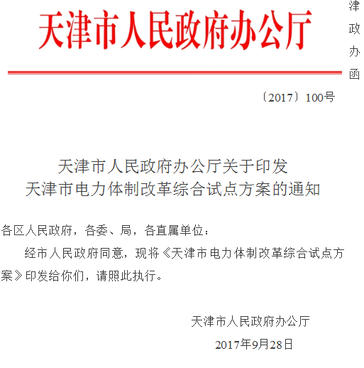 天津市人民政府辦公廳于2017年9月28日發(fā)布了關(guān)于印發(fā)《天津市電力體制改革綜合試點(diǎn)方案的通知》。方案中稱,將有序放開發(fā)用電計(jì)劃、推進(jìn)售電主體多元化。規(guī)范市場(chǎng)化交易規(guī)則,推動(dòng)電力直接交易,完善輔助服務(wù)交易