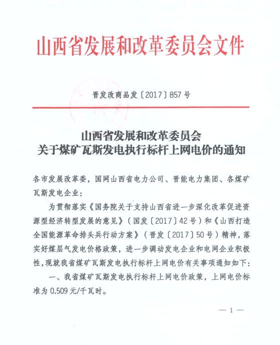 山西省發(fā)展改革委:煤礦瓦斯發(fā)電執(zhí)行0.509元/千瓦時標(biāo)桿上網(wǎng)電價政策