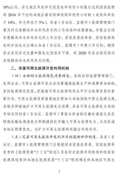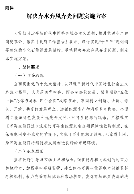 為貫徹習(xí)近平新時(shí)代中國(guó)特色社會(huì)主義思想,推進(jìn)能源生產(chǎn)和消費(fèi)革命,落實(shí)《政府工作報(bào)告》要求,盡快解決棄水棄風(fēng)棄光問(wèn)題,國(guó)家發(fā)展改革委、國(guó)家能源局組織制定了《解決棄水棄風(fēng)棄光問(wèn)題實(shí)施方案》,現(xiàn)印發(fā)你們。請(qǐng)各地區(qū)和有關(guān)單位高度重視可再生能源電力消納工作,積極落實(shí)方案提出的各項(xiàng)任務(wù)要求,采取有效措施提高可再生能源利用水平,推動(dòng)解決棄水棄風(fēng)棄光問(wèn)題取得實(shí)際成效。