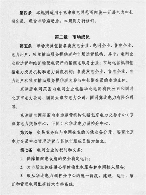 國(guó)家能源局華北監(jiān)管局日前印發(fā)了《京津唐電網(wǎng)電力中長(zhǎng)期交易暫行規(guī)則》,規(guī)則自印發(fā)之日起施行。《京津唐電網(wǎng)電力用戶與發(fā)電企業(yè)直接交易暫行規(guī)則》同時(shí)廢止。該規(guī)則適用于京津唐電網(wǎng)范圍內(nèi)統(tǒng)一開展電力中長(zhǎng)期交
