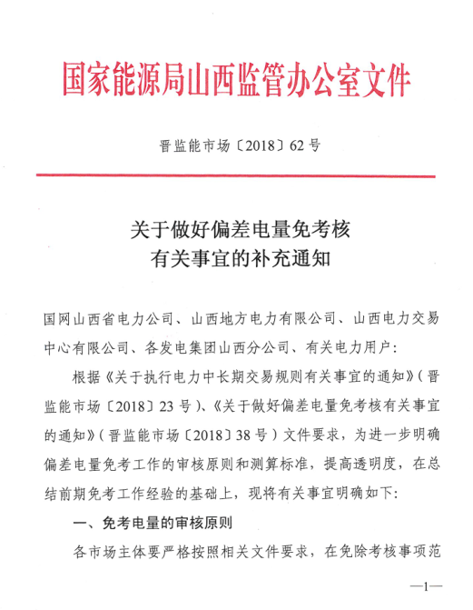 國(guó)家能源局山西監(jiān)管辦日前發(fā)布了《關(guān)于做好偏差電量免考核有關(guān)事宜的補(bǔ)充通知》,通知中對(duì)免考電量的審核原則進(jìn)行了公布,五種情況不予免除