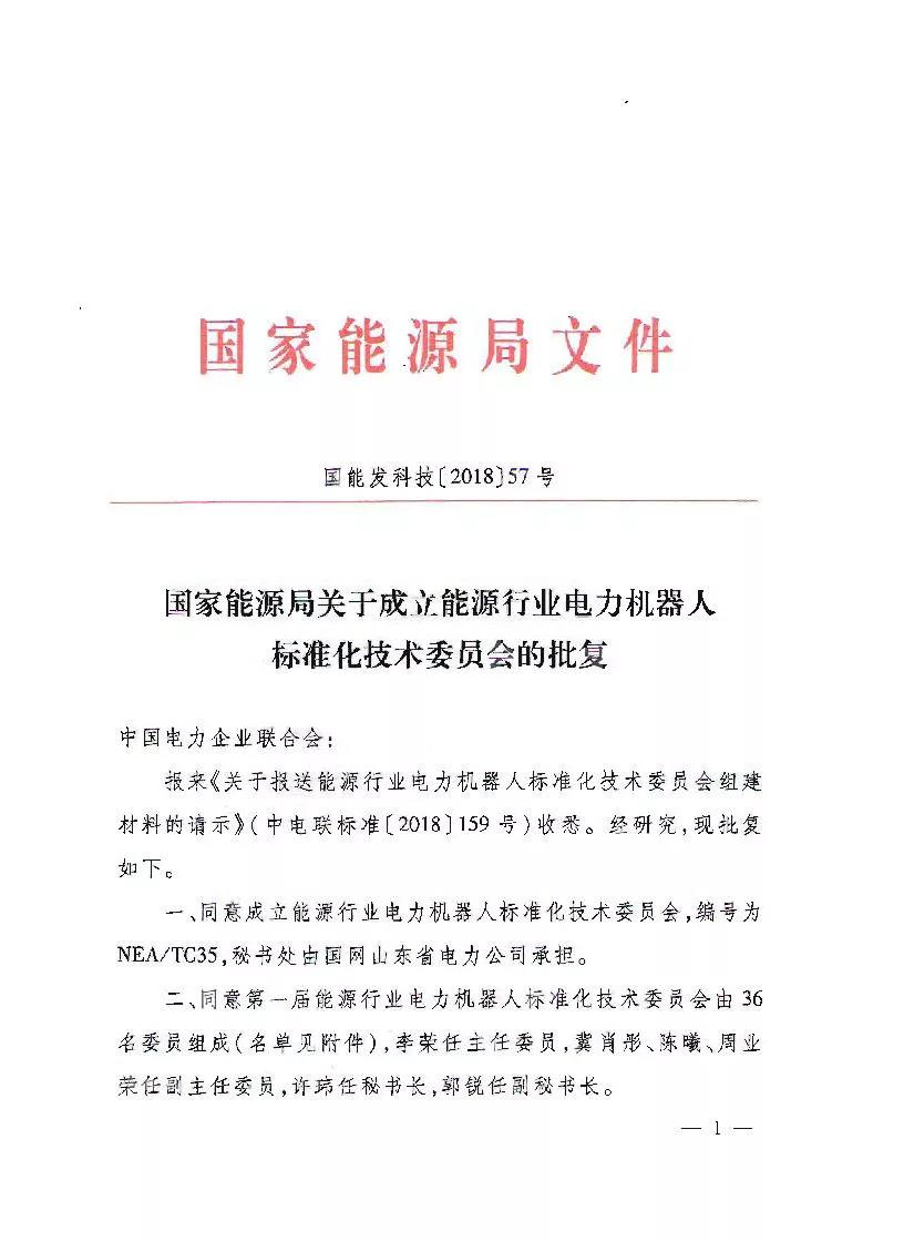 國家能源局關于成立能源行業(yè)電力機器人標準化技術委員會的批復 國能發(fā)科技〔2018〕57號,具體內容如下: