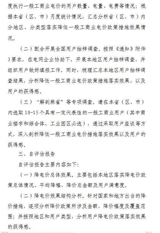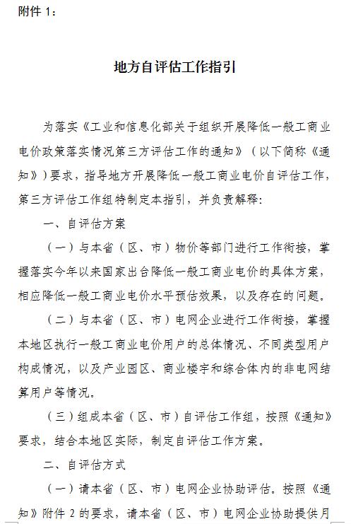 (一)請各省(區(qū)、市)工業(yè)和信息化主管部門,按照《地方自評估工作指引》(見附件1)要求,通過用戶抽樣調(diào)查、“解剖麻雀”、電網(wǎng)企業(yè)協(xié)助調(diào)查等方式,組織完成對本地區(qū)降低一般工商業(yè)電價政策措施落實情況自評估工作,形成正式書面評估報告,經(jīng)省(區(qū)、市)人民政府同意后,于2019年1月15日前報第三方評估工作組。