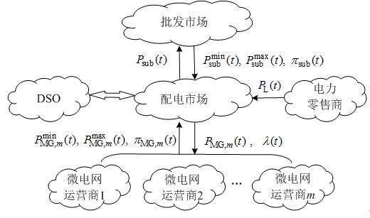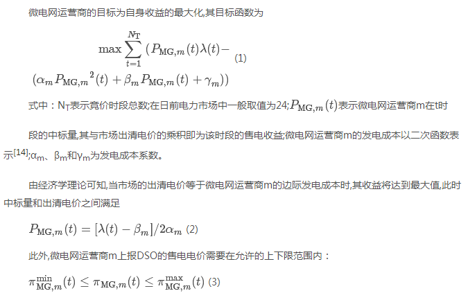 微電網(wǎng)(microgrid,MG)因其供電可靠、運行方式靈活及對環(huán)境友好等特點,近年來得到了廣泛的關注與發(fā)展[1-4]。隨著主動配電網(wǎng)技術的日漸成熟,未來在配電系統(tǒng)中將有越來越多的微電網(wǎng)接入,給配電網(wǎng)的運行和控制帶來顯著的影響[5-7]。與此同時,中央《關于進一步深化電力體制改革的若干意見(中發(fā)[2015]9號)文》提出了“放開售電側,多途徑培養(yǎng)市場主體”的要求??梢灶A見,未來微電網(wǎng)將作為新興的市場主體,參與到配電側電力市場的競爭中。在此背景下,研究微電網(wǎng)參與下的配電側電力市場交易和競價機制顯得十分必要[8]。