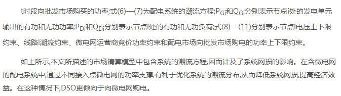 摘要:隨著售電側市場改革的不斷深入,研究多個微電網(wǎng)運營商參與下的配電側市場交易和競價機制具有重要意義。針對該問題,提出了一種雙層優(yōu)化方法:底層優(yōu)化以配電市場運營商購電成本最小為目標,考慮系統(tǒng)的節(jié)點電壓約束和支路潮流約束等,采用跟蹤中心軌跡內(nèi)點法求解系統(tǒng)的經(jīng)濟調(diào)度模型,實現(xiàn)市場的出清;上層優(yōu)化以最大化微電網(wǎng)運營商收益為目標,采用遺傳算法確定微電網(wǎng)運營商在聯(lián)盟和不聯(lián)盟兩種環(huán)境下的最優(yōu)競價策略。在雙層優(yōu)化方法的基礎上,基于完全信息下的動態(tài)博弈方法,確定市場的納什均衡點。最終在IEEE 33節(jié)點配電系統(tǒng)算例中對所提出的方法進行了仿真驗證,并進一步分析了微電網(wǎng)運營商提供無功輔助服務下各市場主體的利益分配問題。