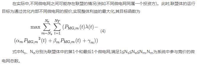 微電網(wǎng)運營商第2日各時段可參與競價的功率范圍取決于自身的負荷預測、可再生能源(如光伏、風機等)出力預測以及可控分布式電源(如微型燃氣輪機等)、可控負荷及儲能等單元的可調(diào)度功率范圍,是針對微電網(wǎng)內(nèi)部各單元優(yōu)化的結果[20]。本文僅考慮各微電網(wǎng)運營商售電的場景,且認為各時段可參與競價的功率范圍已知。