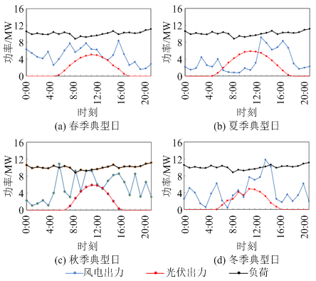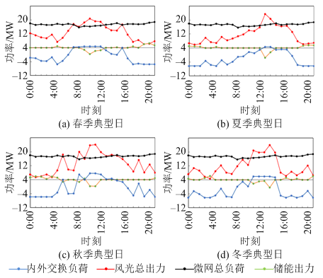圖9和圖10為傳統(tǒng)運(yùn)營模式和一體化運(yùn)營模式下,春、夏、秋、冬四季典型日微網(wǎng)的運(yùn)行情況(儲能出力負(fù)值表示充電,內(nèi)外交換負(fù)荷負(fù)值表示外部電網(wǎng)供電)。