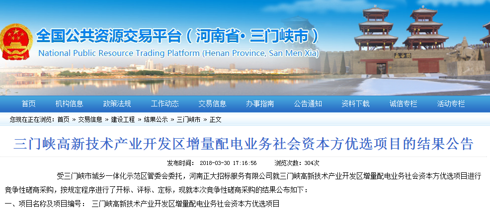 河南省三門峽市公共資源交易平臺日前發(fā)布了公示信息:三門峽高新技術(shù)產(chǎn)業(yè)開發(fā)區(qū)增量配電業(yè)務(wù)社會資本方優(yōu)選項目通過市場化方式公開選定了業(yè)...