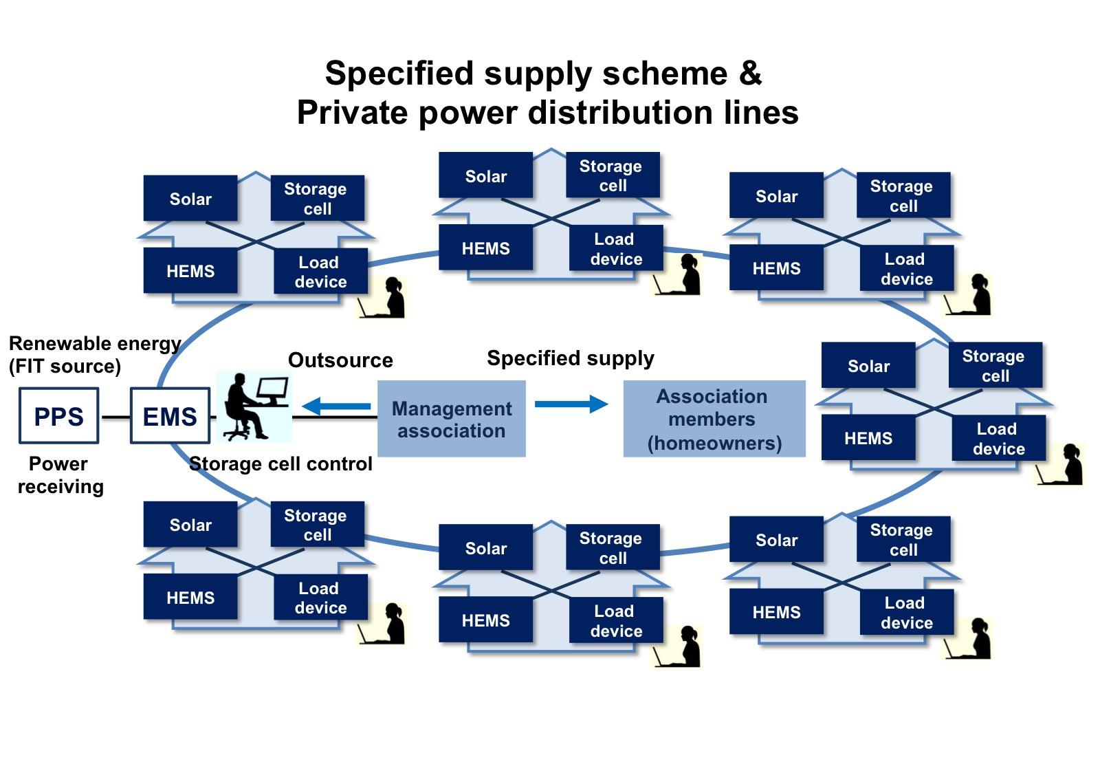 這是由PanaHome、ENERES、興銀租賃和公共事業(yè)局共同開展的項目。項目概念是打造“通過生活能源相互聯(lián)系的城鎮(zhèn)”。PanaHome購買了由公共事業(yè)局開發(fā)的土地。松下公司和蘆屋市也參與配合該項目開發(fā)。構(gòu)建日本首個(*2)微電網(wǎng)系統(tǒng)是該項目的一部分。太陽能將用于為這一整個住宅區(qū)域提供80%或以上的電力(*3)。通過專用配電線(*4)向住宅區(qū)域供電以及在家庭用戶之間共享電力讓上述情況變得切實可行。即使該地區(qū)在緊急情況期間與傳統(tǒng)電網(wǎng)斷開連接時,專用配電線也可通過特定電路繼續(xù)供電。專用配電線使得通電和靈活設(shè)置電價變?yōu)榭赡?。因此,這將為屋主帶來諸多益處,包括減少20%的電費。另一個關(guān)鍵目標(biāo)是對環(huán)境有所貢獻(xiàn),主要是盡量利用可再生能源來減少二氧化碳排放。展望未來,該項目將有助于催生樓宇間共享電力的解決方案,從而防止電網(wǎng)相對薄弱的外部地區(qū)以及在外部展示這些解決方案時斷電。