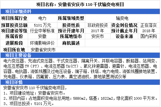 安徽省安慶市110千伏輸變電項(xiàng)目、湖北省恩施州水庫(kù)電站增效擴(kuò)容改造項(xiàng)目、江西省吉安市風(fēng)電場(chǎng)220kV升壓站項(xiàng)目,最高項(xiàng)目總投資達(dá)10000萬(wàn)元。項(xiàng)目主要設(shè)備有:電力變壓器、充油式變壓器、干式變壓器、隔離開(kāi)關(guān)、并