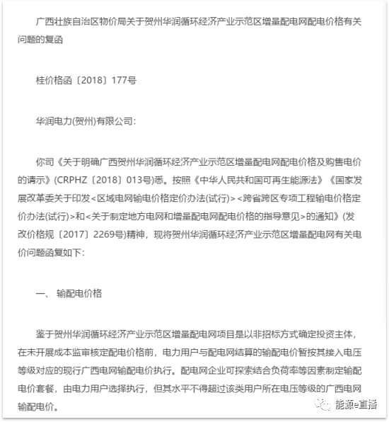 下圖是廣西自治區(qū)物價局針對賀州華潤循環(huán)經(jīng)濟產(chǎn)業(yè)示范園區(qū)增量配電網(wǎng)配電價格核定的一個函。其中提到:“配電企業(yè)可探索結(jié)合負(fù)荷率等因素制定輸配電價套餐,由電力用戶選擇執(zhí)行,但其水平不得超過該類用戶所在電壓等級的廣西電網(wǎng)收費電價”。