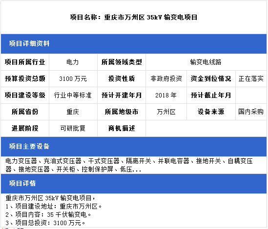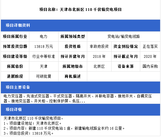 天津市北辰區(qū)110千伏輸變電項(xiàng)目、江蘇省無錫市500千伏輸變電項(xiàng)目、重慶市萬州區(qū)35kV輸變電項(xiàng)目三項(xiàng)工程正在落實(shí)項(xiàng)目建設(shè)資金。