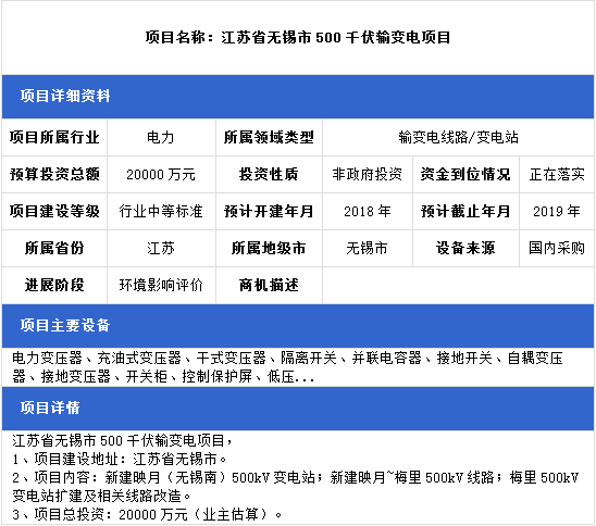 天津市北辰區(qū)110千伏輸變電項(xiàng)目、江蘇省無錫市500千伏輸變電項(xiàng)目、重慶市萬州區(qū)35kV輸變電項(xiàng)目三項(xiàng)工程正在落實(shí)項(xiàng)目建設(shè)資金。項(xiàng)目主要設(shè)備