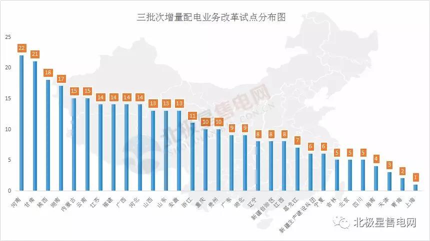 在數(shù)量上,三個(gè)批次的增量配電業(yè)務(wù)改革試點(diǎn)共分布于31個(gè)省區(qū)市,其中河南最多,共有22個(gè)項(xiàng)目收入囊中;甘肅其次,有21個(gè)項(xiàng)目試點(diǎn)。陜西以18個(gè)位居第三。