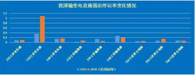 從強(qiáng)迫停運(yùn)率上看,近五年,我國變壓器、斷路器、架空線路三類輸變電設(shè)施強(qiáng)迫停運(yùn)率下降幅度較大。2016年,我國變壓器、斷路器、架空線路強(qiáng)迫停運(yùn)率,較2012年分別下降0.037次/百臺年、0.052次/百臺年和0.008次/百臺年。