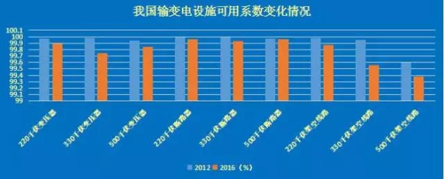 從可用系數(shù)上看,近五年,我國220千伏及以上輸變電設(shè)施輸變電設(shè)備變壓器、斷路器、架空線路三類設(shè)施一直保持較高的水平。2016年我國輸變電設(shè)備變壓器、斷路器、架空線路三類設(shè)施可用系數(shù),較2012年下降0.096、0.029和0.258個百分點。