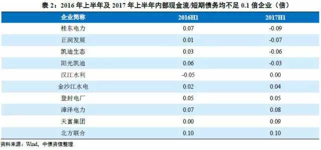 短期償債指標(biāo)方面,2017年6月末樣本企業(yè)現(xiàn)金類資產(chǎn)/短期債務(wù)為0.30倍,較去年同期(0.30倍)變化不大。考慮到電力行業(yè)涉及國(guó)計(jì)民生,外部支持力度較大,整體融資環(huán)境較好,短期償債表現(xiàn)仍較好。根據(jù)樣本數(shù)據(jù),2017年上半年內(nèi)部現(xiàn)金流/短期債務(wù)不足0.5倍的企業(yè)共49家(占樣本企業(yè)總數(shù)的90.74%),同比增長(zhǎng)7家。此外,41家企業(yè)內(nèi)部現(xiàn)金流/短期債務(wù)有所下降(占樣本企業(yè)總數(shù)的75.93%)。