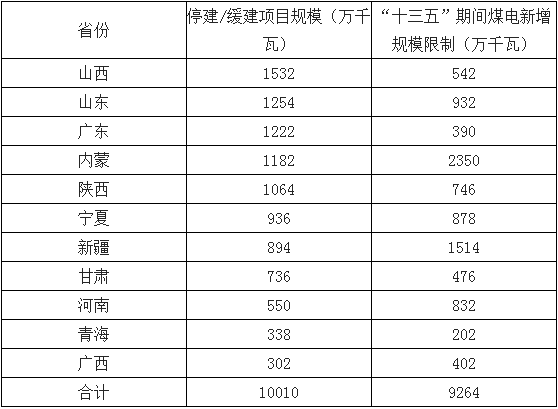 “十三五”期間煤電停建/緩建規(guī)模及新增規(guī)模限制