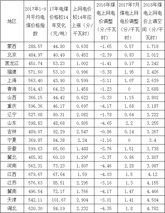 2018年各省區(qū)煤電上網(wǎng)電價(jià)較14年應(yīng)調(diào)整幅度